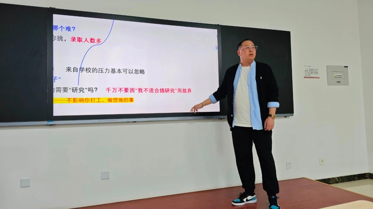 曲老师用“祛魅”定义这次动员。“祛魅”和“考研”一样,都是大学里的热词。如何“祛魅”考研?曲老师从这个链条的最后讲起:考研的结果就是诸多优势,如能够帮助同学们提高进入社会的起点、积累社会资本,提供改换专业机会和提高工作收入等。