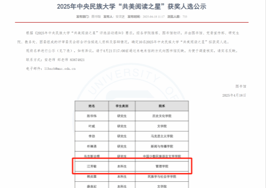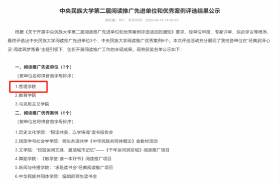 从“百秒十课万次”到“一路两人三关”,管院学子在学习过程中有共鸣、能共情,继而创新实践思想根基。未来,学院将继续努力开展更多内容丰富、形式多样的读书活动,为培养“厚基础、宽视野、重创新”的高素质人才、推进中华民族共同体建设贡献民大智慧。 今天是“世界读书日”,希望越来越多的师生积极响应全民阅读号召,把读书作为人生“刚需”,不断提升自身的文化素养和综合素质!