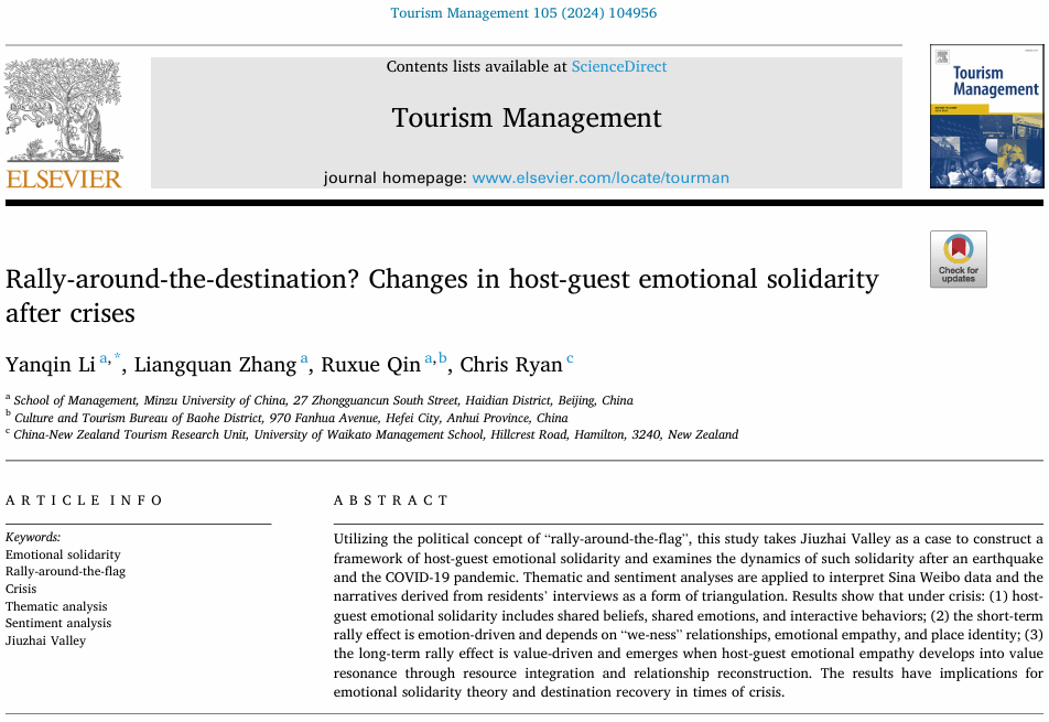 李燕琴教授团队在《Tourism Management》上发表题为“Rally-around-the-destination? Changes in host-guest emotional solidarity after crises”的学术论文。《Tourism Management》的影响因子为12.7,是旅游管理类三大国际权威期刊之一,也是ABS四星级期刊,2023年中科院分区表升级版中为1区TOP期刊。