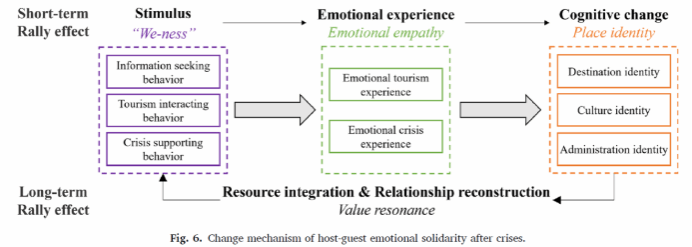 近年,四川省九寨沟连续遭受了两次危机事件的冲击,即2017年8月8日7.0级地震、2020年开始的COVID-19新冠肺炎疫情。本研究首次将政治学领域的聚旗效应引入旅游研究,提出了“旅游目的地聚旗效应”的概念,从心理学、社会学和政治学的跨学科角度,揭示了两次危机之后,主客之间在旅游目的地引发聚旗效应的机制。具体而言,短期聚旗效应的产生由情感驱动,取决于“我们关系”、“情感共鸣”和“地方认同”;长期聚旗效应的产生由价值驱动,即当短期的主客情感共鸣通过“资源整合”和“关系重构”演变为价值共振时,长期聚旗效应就会出现。该研究是李燕琴教授团队旅游促进交往交流交融研究的系列成果之一,可为旅游业中主人与客人情感团结动态及其机制研究提供新思路。